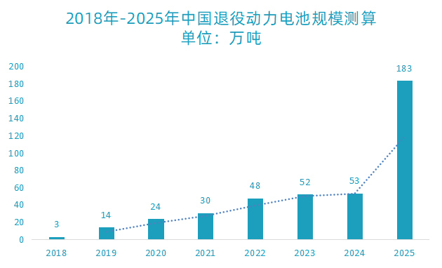 根據(jù)新能源汽車年裝機(jī)量,按120wh/kg電池能量密度,使用4年后退役回收,粗算退役電池規(guī)模。2020年約有24萬(wàn)噸動(dòng)力電池退役。