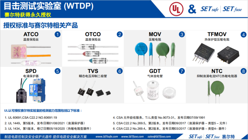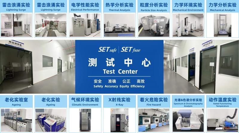 賽爾特SETsafe丨SETfuse取得美國UL認(rèn)可目擊測試實(shí)驗(yàn)室(WTDP)(UL 1449、UL 1434、UL 60691)、德國TUV萊茵授權(quán)實(shí)驗(yàn)室資質(zhì)(IEC/EN 60691、IEC/EN 61051-1、IEC/EN 61051-2、IEC/EN 62368-1、IEC/EN 61643-11、IEC/EN 61643-21、IEC/EN 61643-31、IEC/EN 62319-1、IEC/EN 62319-1-1、IEC/EN 60539-1)。超過1000多項(xiàng)的專業(yè)的測試、實(shí)驗(yàn)設(shè)備,多個(gè)設(shè)備是業(yè)界最好的品牌。