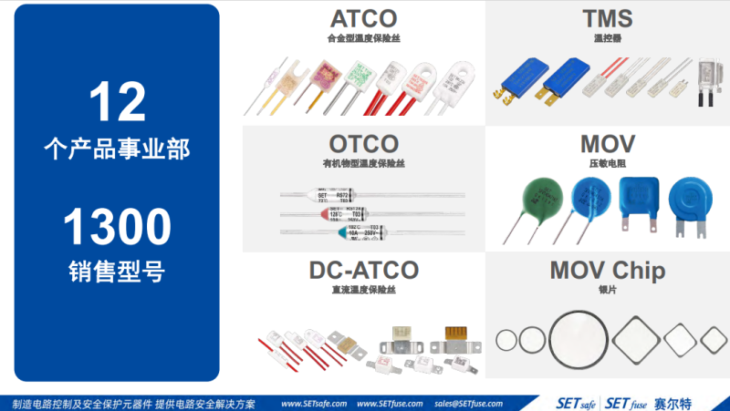 溫度保險(xiǎn)絲 (ATCO、OTCO)、合金型直流型溫度保險(xiǎn)絲 (DC-ATCO)、熱保護(hù)器 (TMS)、壓敏電阻 (MOV)、熱保護(hù)型壓敏電阻 (TFV、TFMOV)、電涌保護(hù)器 (SPD)、電涌保護(hù)模組 (SPD-M)、瞬態(tài)電壓抑制二極管 (TVS)、氣體放電管 (GDT) 、小型熔斷器 (Mini Fuses)、線繞熔斷電阻器 (RXF)、熱保護(hù)型熔斷電阻器 (TRXF)、熱保護(hù)型水泥電阻器 (TPR)、抑制浪涌電流NTC熱敏電阻器 (NTC)、低壓熔斷器 (LV Fuses)、受控熔斷器 (iTCO)等,首創(chuàng)、獨(dú)創(chuàng)多個(gè)產(chǎn)品。