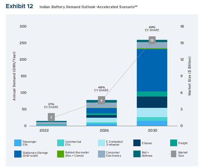 印度在先進電池技術(shù)制造方面的影響力如今微不足道。然而,該國擁有大規(guī)模電池制造的巨大潛力。報告指出,到2030年,印度的電池市場可能超過150億美元(約合1.12萬億盧比),到2030年,印度的電池需求預計將在“加速情景”中上升到260GWh。