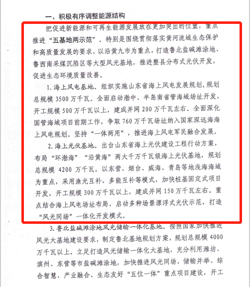——海上風(fēng)電基地。組織實施山東省海上風(fēng)電發(fā)展規(guī)劃,規(guī)劃 總規(guī)模3500萬千瓦。全面啟動渤中、半島南省管海域場址開發(fā),開工規(guī)模500萬千瓦以上,建成并網(wǎng)200萬千瓦左右。全面深化 國管海域項目前期工作,爭取760萬千瓦場址納入國家深遠海海 上風(fēng)電規(guī)劃。堅持"一體兩用",推進海上風(fēng)電軍民融合發(fā)展。