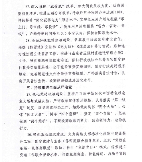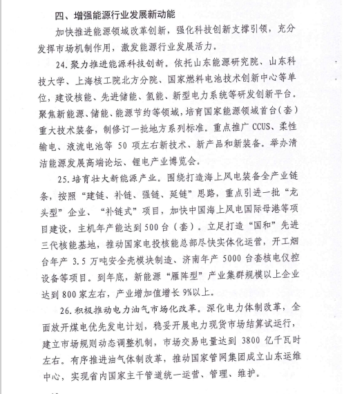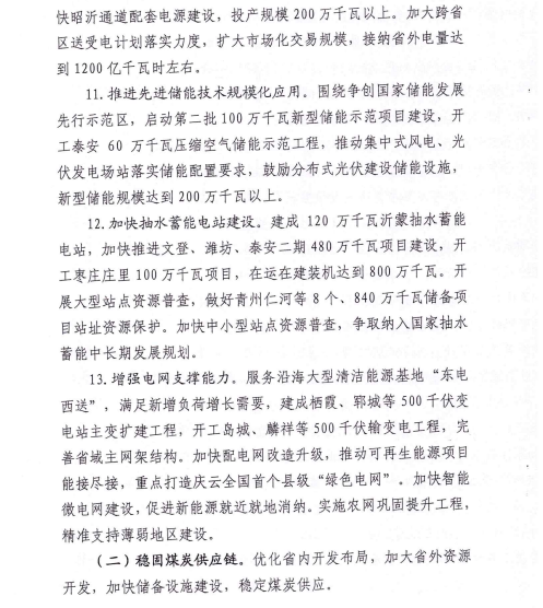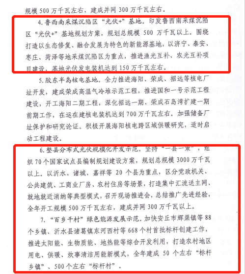 ——整縣分布式光伏規(guī)?;_發(fā)示范。堅持"一縣一策",組 織70個國家試點縣編制規(guī)劃建設(shè)方案,規(guī)劃總規(guī)模3000萬千瓦以上。以沂水、諸城、嘉祥等20個縣為重點,區(qū)分黨政機關(guān)、公共建筑、工商業(yè)廠房、農(nóng)村住房等場景,打造集中匯流送主網(wǎng)、就地就近消納等典型模式,召開現(xiàn)場推進會,總結(jié)推廣先進經(jīng)驗, 全年開工規(guī)模500萬千瓦左右,建成并網(wǎng)300萬千瓦以上。