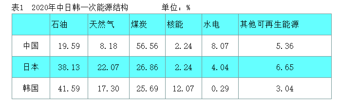 從當(dāng)前碳排放看,中國、日本、韓國碳排放量分別位居全球第一、第五和第八位。據(jù)BP能源統(tǒng)計(jì)年鑒數(shù)據(jù),2020年,日本、韓國能源領(lǐng)域碳排放量分別占全球碳排放總量的3.2%和1.8%,而中國這一占比則高達(dá)30.9%,雖然日本和韓國絕對碳排放量遠(yuǎn)低于中國(見圖1),但受制于高碳化石能源結(jié)構(gòu),日本和韓國實(shí)現(xiàn)碳中和的減排難度同樣不小。從一次能源結(jié)構(gòu)看(見表1),中、日、韓三國化石能源在一次能源消費(fèi)中的占比均超過80%,不同的是,中國一次能源消費(fèi)中以煤炭為主,日本和韓國則以油氣為主。此外,在一次能源消費(fèi)結(jié)構(gòu)中,中國的水電和非水可再生能源占比最高,韓國的可再生能源占比不足5%,在中、日、韓三國中之一指標(biāo)占比最低。綜合來看,碳中和背景下,中、日、韓共同面臨高碳化石能源減量替代、大力推進(jìn)非化石能源尤其是可再生能源發(fā)展的現(xiàn)實(shí)訴求,能源轉(zhuǎn)型的共性需求牽引為中、日、韓加強(qiáng)能源合作迎來新的契機(jī)。