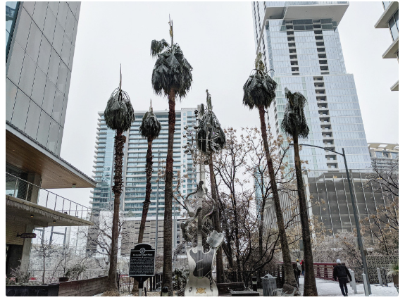 圖2 暴風(fēng)雪期間,美國(guó)得克薩斯州奧斯汀市的氣溫降至零下14 ℃,降雪量超過16 cm。2021 年2 月17 日,冰雪覆蓋了奧斯汀市中心的一些棕櫚樹。來源:Jno. skinner(CC BY-SA 4.0)