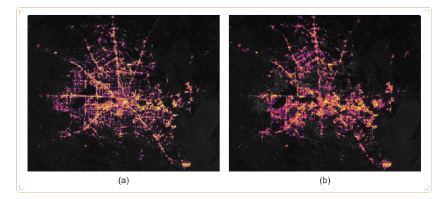 圖1 美國(guó)得克薩斯州休斯頓市在2021 年2 月停電之前(a)和停電期間(b)的衛(wèi)星圖像顯示,該市大片地區(qū)斷電。在危機(jī)期間,該市約有100 萬人在某些時(shí)間用不上電,至少有31 人死于暴風(fēng)雪相關(guān)原因。來源:National Aeronautics and Space Administration Earth Observatory(公共領(lǐng)域)