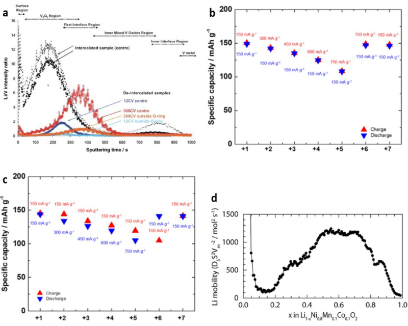 Marcus等人使用ToF-SIMS研究了V2O5薄膜電極循環(huán)后的鋰分布。圖7a顯示,在電極界面和內(nèi)部都發(fā)現(xiàn)了痕量Li+。通過(guò)比較12次和300次循環(huán)后的ToF-SIMS數(shù)據(jù),可以看出隨著循環(huán)的進(jìn)行,富鋰區(qū)不僅尺寸增大,而且深入到電極內(nèi)部。這些結(jié)果表明存在Li+捕獲效應(yīng),電極的脫嵌程度在循環(huán)過(guò)程中降低。Winter等人探究了LiNi1/3Co1/3Mn1/3O2(NCM111)半電池容量衰減的根本原因。圖7b和c顯示,充放電容量都取決于所施加的電流密度。然而,當(dāng)放電電流密度增加時(shí),充電容量與放電容量不同,因此產(chǎn)生容量損失。這是因?yàn)殡S著鋰化電流密度的增加,鋰離子的再鋰化反應(yīng)受到阻礙。