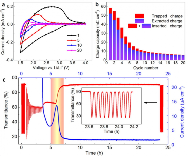 圖 6、非晶WO3薄膜(a)不同循環(huán)的CV曲線,掃速為10 mV s-1,電壓范圍為1.5~4.0 V。(b)充電容量隨循環(huán)數(shù)的變化。(c)在550 nm波長(zhǎng)處測(cè)量的原位光透射率和電流密度作為時(shí)間函數(shù)的恒電位Li+提取在5.5 V。插圖顯示了指定時(shí)間窗口的透射率隨時(shí)間的函數(shù)。