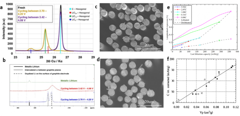 圖 5、電池失效后,使用(a)XRD和(b)7Li核磁共振對(duì)脫鋰狀態(tài)下的石墨電極進(jìn)行測(cè)試。(c)原始碳纖維(CF)(d)和完全鋰化CF的橫截面SEM圖像。(e)不同倍率下,CFs的縱向膨脹率隨最后一次鋰化容量的變化。(f)校正后的不可逆容量隨內(nèi)部孔體積的變化。