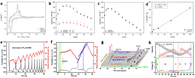 圖 4、(a)Sn納米棒電極第1、25和100圈的循環(huán)伏安圖,掃速為1.0 mV s-1,電壓范圍為0.1~2.5V。(b)鋰化和脫鋰面積容量隨循環(huán)次數(shù)的變化。(c)CV循環(huán)在0.1和1.0 V之間的面積容量。(d)脫鋰Sn納米棒電極中的鋰含量與掃描圈數(shù)的關(guān)系。(e)使用原位電化學(xué)膨脹法獲得的鋁復(fù)合電極的位移曲線和相應(yīng)的循環(huán)曲線,(f)前1.5個(gè)循環(huán)的電極位移和循環(huán)曲線放大圖。(g)Al電極在第一個(gè)循環(huán)期間的原位XRD數(shù)據(jù),(h)相應(yīng)的循環(huán)曲線以及Al(111)和LiAl(111)衍射峰強(qiáng)度變化。