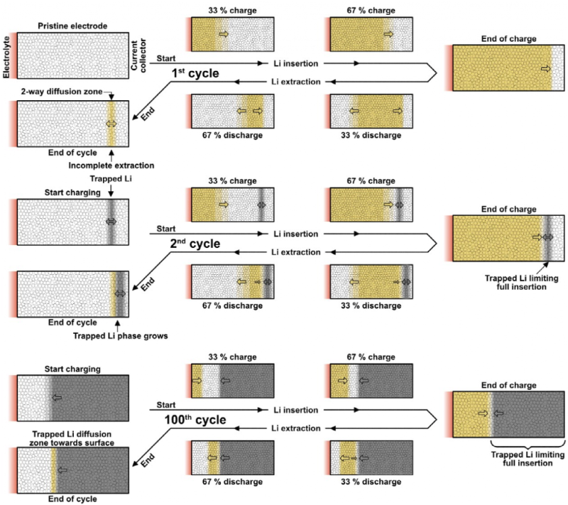 在鋰化過(guò)程中Li僅擴(kuò)散到電極中,而在脫鋰時(shí),Li既可以向電極/電解質(zhì)界面擴(kuò)散,也可以擴(kuò)散到集流體側(cè)。這種雙向擴(kuò)散(圖2)是鋰捕獲效應(yīng)的起源,因?yàn)殡姌O中的一小部分鋰在脫鋰時(shí)變得不可逆。