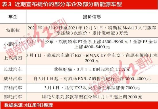 據(jù)《紅周刊》記者不完全統(tǒng)計(jì),自去年12月以來,已有特斯拉、比亞迪、廣汽集團(tuán)、上汽集團(tuán)、長(zhǎng)城汽車、小鵬、零跑等約20家車企宣布上調(diào)其旗下新能源汽車銷售價(jià)格,漲價(jià)金額多在數(shù)千元至數(shù)萬(wàn)元不等(見表3)。