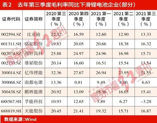 國(guó)內(nèi)某鋰電池企業(yè)相關(guān)負(fù)責(zé)人向《紅周刊》記者表示,去年,包括鋰電池原材料在內(nèi)的綜合成本增加了40%。事實(shí)上,自去年下半年以來,鋰電材料漲價(jià)因素對(duì)鋰電池企業(yè)的業(yè)績(jī)、毛利的影響已經(jīng)開始加劇,這從去年鋰電池企業(yè)三季度的毛利數(shù)據(jù)可以很直觀地看到。如億緯鋰能,毛利率由2020年第三季度的32.36%下降至去年第三季度的21.55%,降幅為33%;國(guó)軒高科則由25.88%下降至15.71%,降幅為39%;孚能科技則由10.93%變?yōu)樨?fù)值(見表2)。