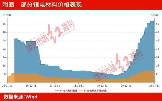 據(jù)Wind數(shù)據(jù)顯示,截至3月10日,如碳酸鋰(磷酸鐵鋰電池正極材料原料)報(bào)收50.1萬(wàn)元/噸,相較于今年初27.8萬(wàn)元/噸(1月4日?qǐng)?bào)價(jià))上漲80%,相較于去年同期漲幅達(dá)5倍;電解液核心原材料六氟磷酸鋰報(bào)價(jià)55萬(wàn)元/噸,同比上漲達(dá)2.33倍;磷酸鐵鋰電池電解液價(jià)格報(bào)收11.03萬(wàn)元/噸,同比上漲162%(見附圖)。