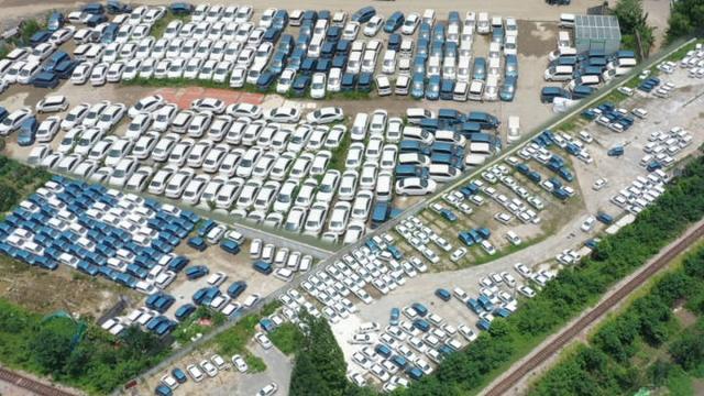 相比前一個停車場,這里的車型稍微高檔一些,有北汽EU5、榮威、吉利等車型,續(xù)航400-500公里,但車況也不如人意,生銹的,發(fā)霉的,長了青苔的比比皆是。