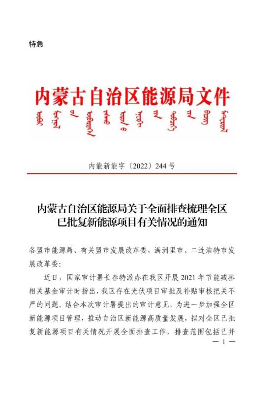 中國儲能網(wǎng)訊:3月9日,內(nèi)蒙古自治區(qū)能源局發(fā)布特急文件《關(guān)于全面排查梳理全區(qū)已批復(fù)新能源項(xiàng)目有關(guān)情況的通知》(內(nèi)能新能字(2022)244號),通知指出: