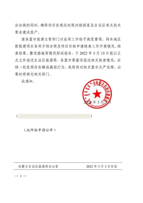 請各盟市能源主管部門對此項(xiàng)工作給予高度重視,將本地區(qū)新能源項(xiàng)目各項(xiàng)手續(xù)辦理及項(xiàng)目補(bǔ)貼申請核查工作開展情況、核 查結(jié)果、整改措施等情況形成報告,于2022年3月15日前以正式文件報送自治區(qū)能源局。各盟市要據(jù)實(shí)報送相關(guān)核查情況,后續(xù)一經(jīng)發(fā)現(xiàn)存在瞞報漏報行為,我局將對相關(guān)盟市從嚴(yán)處理,必要時將移交相關(guān)部門。