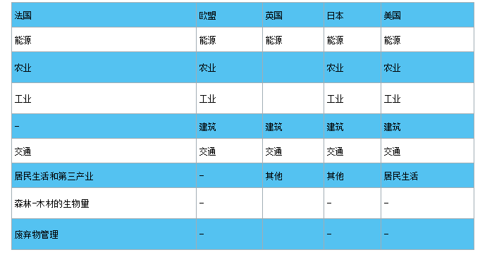 從涉及領(lǐng)域的角度看,大部分國家或地區(qū)的碳中和戰(zhàn)略規(guī)劃都將能源部門、農(nóng)業(yè)部門、工業(yè)部門、建筑部門和居民生活納入。同時(shí),法國的《國家低碳戰(zhàn)略》中,“居民生活和第三產(chǎn)業(yè)”部分包括了建筑領(lǐng)域;日本和法國對廢棄物管理做出了規(guī)劃,英國則在其他部門中制定了廢棄物管理相關(guān)碳中和規(guī)劃。