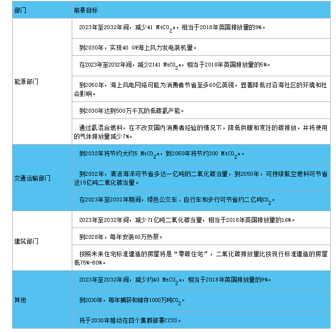 為支撐上述目標(biāo)實(shí)現(xiàn),英國配套了以下政策措施,主要有:一是在能源方面,配套2.4億英鎊的凈零氫基金,投入最高3.85億英鎊的先進(jìn)核基金;二是在交通方面,到2030年停止銷售新的汽油和柴油汽車和貨車,并要求銷售的新車中至少50%的乘用車和40%的貨車必須實(shí)現(xiàn)超低排放,從2035年起達(dá)到100%零排放;三是在交通運(yùn)輸方面,英國將投資42億英鎊用于城市公共交通,50億英鎊用于公共汽車、自行車和步行,投資1500萬英鎊支持可持續(xù)航空燃料(SAF)的生產(chǎn);四是在建筑方面,實(shí)施“未來家居標(biāo)準(zhǔn)”;五是投入10億英鎊成立CCUS基礎(chǔ)設(shè)施基金。