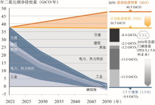 注:圖中藍(lán)色陰影區(qū)域表示1.5-S中相應(yīng)部門的剩余凈CO2排放量,灰色區(qū)域表示1.5-S中相對于PES的CO2排放減少量。工業(yè)包括與能源和過程相關(guān)的二氧化碳排放。“其他”包括非能源使用和農(nóng)業(yè)、林業(yè)等其他部門的排放。工業(yè)、電力和熱電廠的排放包括通過碳捕獲、BECCS和其他碳去除措施捕獲的二氧化碳排放。到2050年,工業(yè)和電力熱力供應(yīng)部門的排放變成凈負(fù)值??傮w而言,2050年1.5-S情境下,二氧化碳凈排放量將達(dá)到-0.4 Gt。