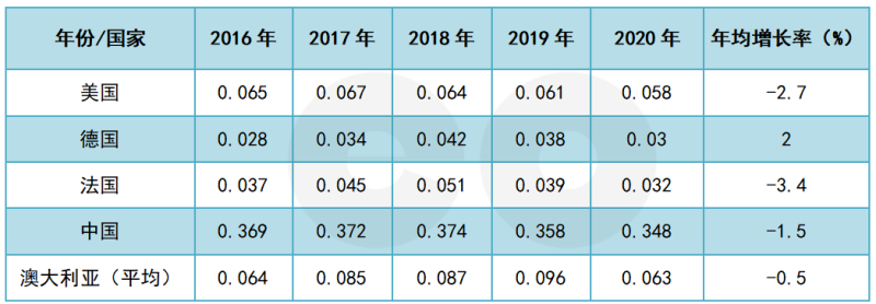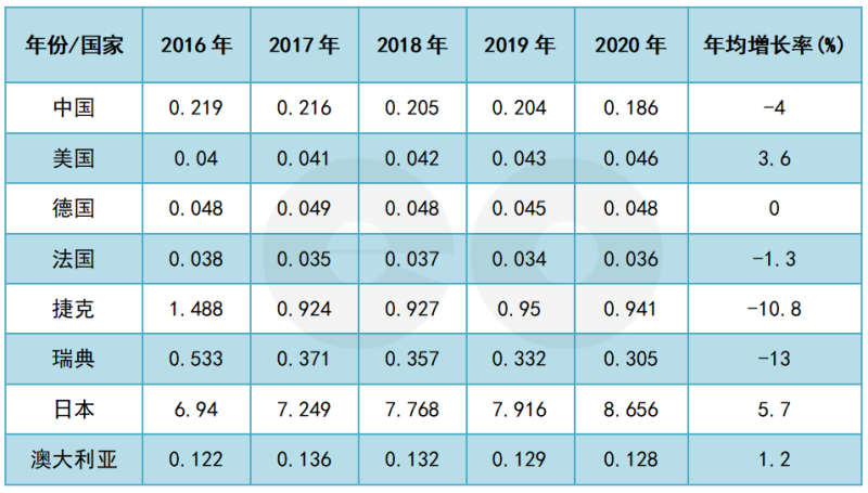表1 2016-2020年部分國家(地區(qū))上網(wǎng)電價(或批發(fā)電價)情況(本幣元/千瓦時)