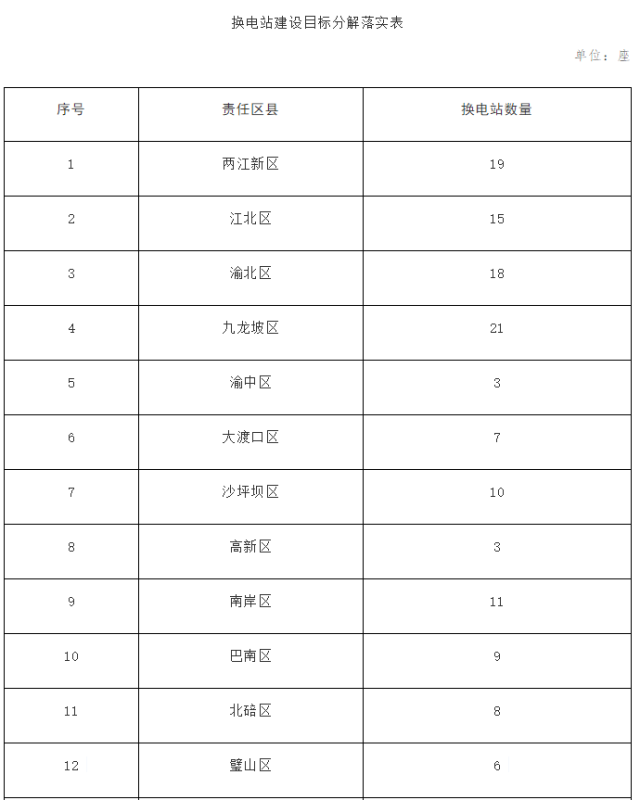 (一)科學(xué)合理規(guī)劃布局。優(yōu)先在兩江新區(qū)、江北區(qū)、南岸區(qū)、重慶高新區(qū)、綦江區(qū)、永川區(qū)、萬州區(qū)、黔江區(qū)、長壽區(qū)等區(qū)域開展試點,加快推動中心城區(qū)全覆蓋。鼓勵有市場需求的區(qū)縣開展試點,形成中心城區(qū)和區(qū)縣聯(lián)動的換電網(wǎng)絡(luò)體系,逐步實現(xiàn)全市覆蓋。各區(qū)縣應(yīng)結(jié)合本地區(qū)電動汽車推廣和市場需求,合理規(guī)劃布局,在滿足相關(guān)安全控制要求的前提下,充分利用現(xiàn)有充電場站、停車場、P+R停車場、加油(加氣)站等已有場地資源加快換電站建設(shè),全面推進形成全市公交站、火車站、機場、碼頭、高速公路等交通熱點區(qū)域全覆蓋的換電網(wǎng)絡(luò)布局。(責(zé)任單位:市規(guī)劃自然資源局、市住房城鄉(xiāng)建委、市經(jīng)濟信息委、市交通局,區(qū)縣政府,國網(wǎng)重慶市電力公司)