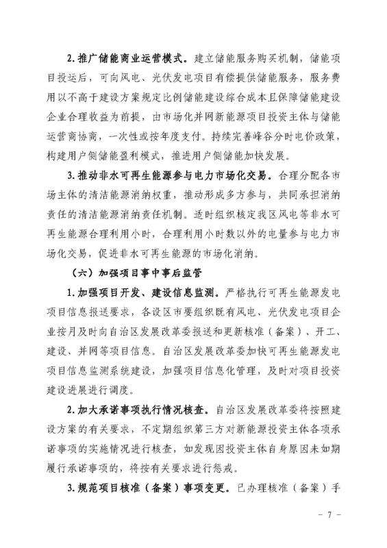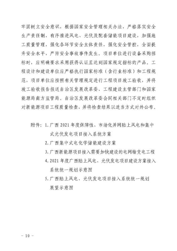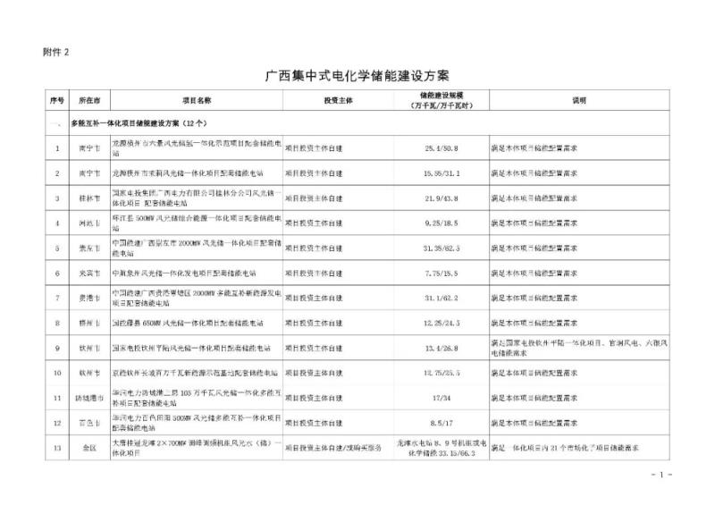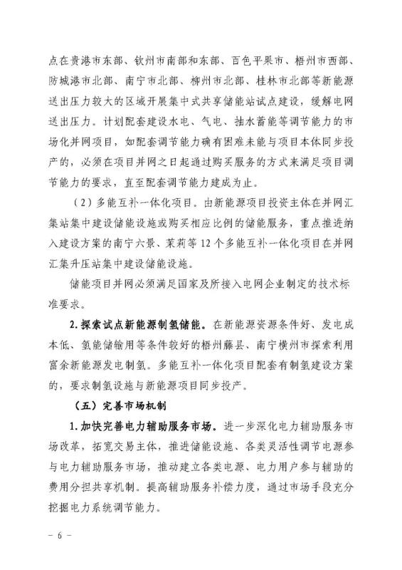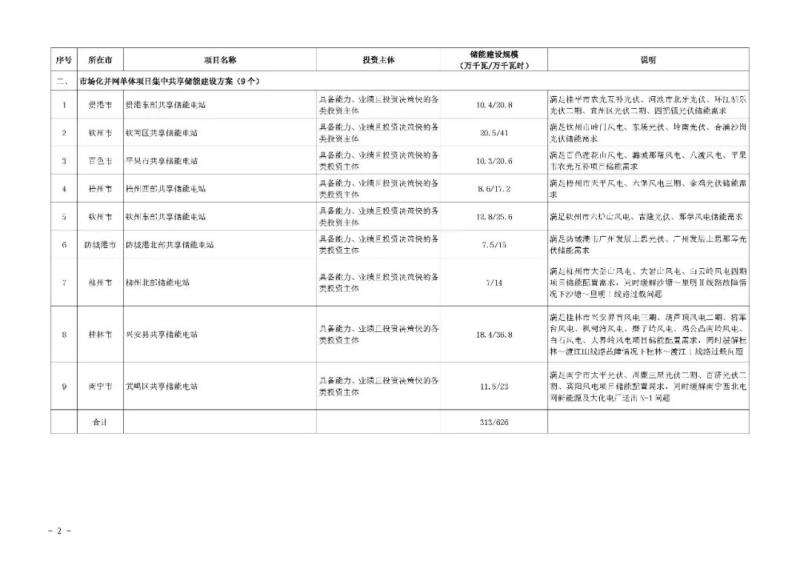 須按照要求配置相應(yīng)的調(diào)節(jié)能力或購買相應(yīng)比例的儲能服務(wù),并與項目本體同步建成投產(chǎn)或在項目并網(wǎng)前完成服務(wù)協(xié)議簽訂。鼓勵電網(wǎng)企業(yè)及有實力的新能源投資企業(yè)在系統(tǒng)需要的區(qū)域建設(shè)集中共享儲能設(shè)施,重點在貴港市東部、欽州市南部和東部、百色平果市、梧州市西部、防城港市北部、南寧市北部、柳州市北部、桂林市北部等新能源送出壓力較大的區(qū)域開展集中式共享儲能站試點建設(shè),緩解電網(wǎng) 送出壓力。計劃配套建設(shè)水電、氣電、抽水蓄能等調(diào)節(jié)能力的市場化并網(wǎng)項目,如配套調(diào)節(jié)能力確有困難未能與項目本體同步投產(chǎn)的,必須在項目并網(wǎng)之日起通過購買服務(wù)的方式來滿足項目調(diào)節(jié)能力的要求,直至配套調(diào)節(jié)能力建成為止。