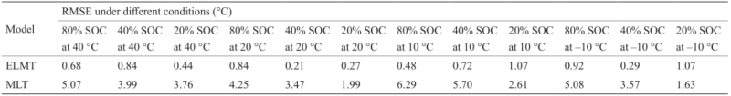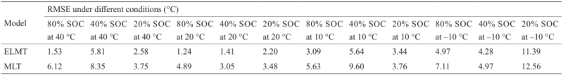 表6顯示了兩種模型在不同SOC值和環(huán)境溫度下的溫度預(yù)測值與測量值之間RMSE結(jié)果的比較。表7顯示了在不同環(huán)境溫度以及所有條件下溫度預(yù)測的RMSE平均結(jié)果比較。如表7所示,ELMT模型所有條件下的 RMSE平均值僅為3.97 ℃,而MLT模型所有條件下的 RMSE平均值為6.11 ℃??梢园l(fā)現(xiàn),ELMT模型相比 MLT模型具有更高的溫度預(yù)測精度。