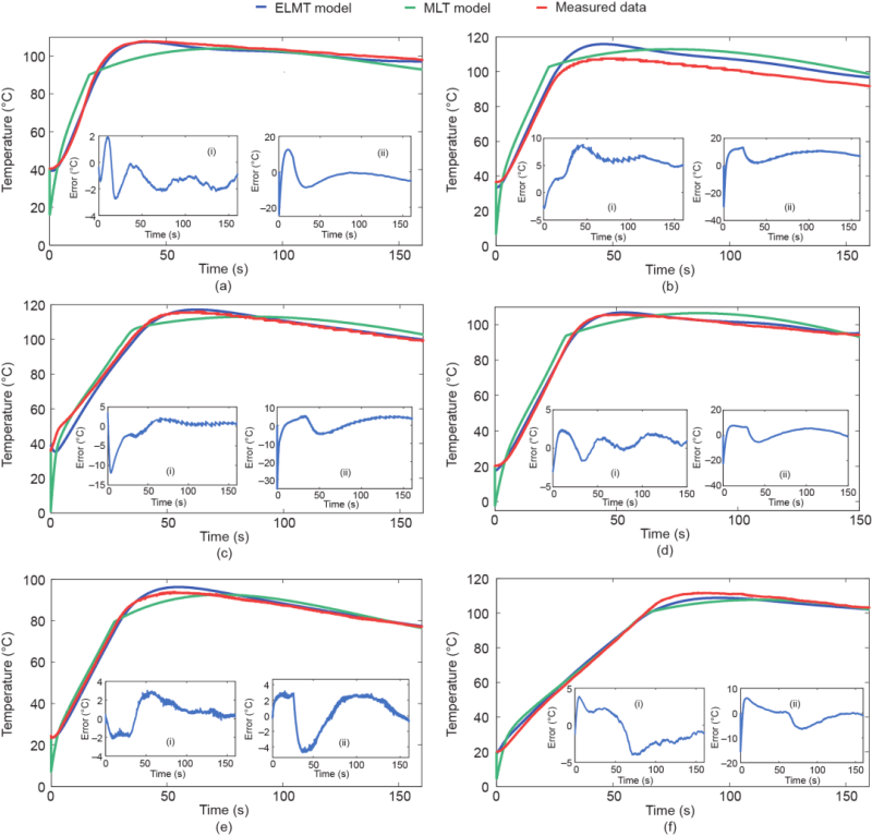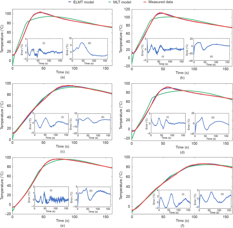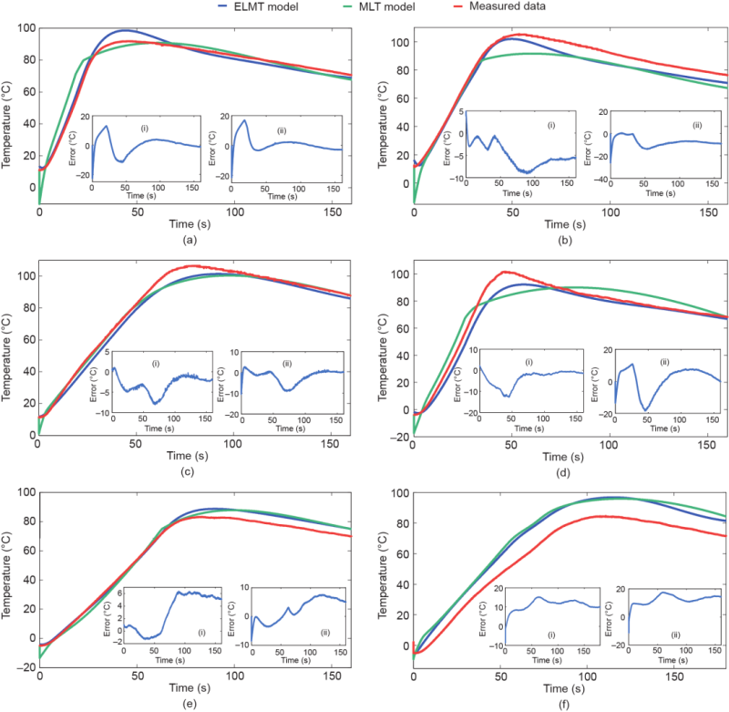 為了證明ELMT模型的優(yōu)勢,將MLT模型作為對照模型。MLT模型的結(jié)構(gòu)與圖6所示的ELMT模型相同,然而Ri 、h、Cp和βj需要進行迭代調(diào)整以逼近實驗數(shù)據(jù)。為公平比較,MLT模型由5個集總參數(shù)熱模型組成,因此MLT模型中共有20個可調(diào)參數(shù),這與ELMT模型中的可調(diào)參數(shù)(連接隱含層與輸出層之間的20個權(quán)重βj )相同。