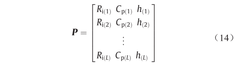 公式(13)表達了每一時刻溫度的輸出結(jié)果可以通過L個子模型輸出加權(quán)后求和得到。在每個集總參數(shù)子模型中,可以直接測量電池質(zhì)量、表面積A和環(huán)境溫度 Tamb。未知的參數(shù)矩陣P可以表達為