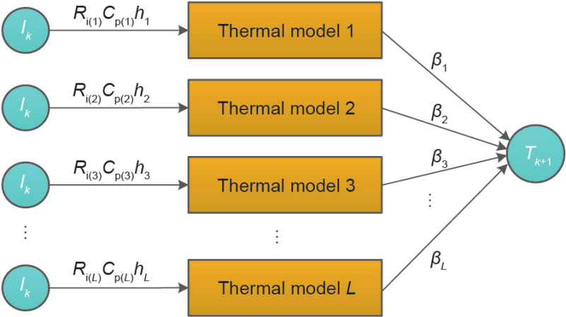 在本文中,結(jié)合具備實際物理意義的集總參數(shù)熱模型與經(jīng)典極限學(xué)習(xí)機,提出一種基于極限學(xué)習(xí)機的生熱模型,即ELMT模型,來描述動力電池在外部短路條件下的溫度行為。具體來說,將經(jīng)典極限學(xué)習(xí)機中的激活函數(shù)替換為3.1節(jié)中介紹的集總參數(shù)熱模型。ELMT 模型的結(jié)構(gòu)如圖6所示,其中使用L個集總參數(shù)子模型。將電流Ik作為模型輸入,溫度Tk+1作為模型輸出(k = 1, 2, …, N–1),N–1表示溫度輸出數(shù)據(jù)的總量。L個集總參數(shù)子模型可以被視為極限學(xué)習(xí)機中的激活函數(shù)。