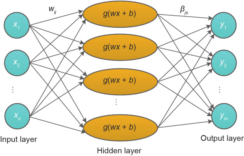 圖5 經(jīng)典極限學(xué)習(xí)機結(jié)構(gòu)圖。x和y表示輸入和輸出數(shù)據(jù);n和m為輸入層和輸出層的總數(shù)據(jù)量;w為輸入層和隱含層之間的連接權(quán)值;βjs 為隱含層和輸出層之間的連接權(quán)值;g(?)表示激活函數(shù);b表示隱含層中的閾值;i表示第i個輸入數(shù)據(jù);j表示第j個隱含層神經(jīng)元;s表示第 s個輸出數(shù)據(jù)
