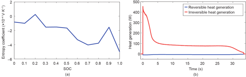 總體來說,不可逆反應(yīng)生熱包括以下兩個部分:①電流流經(jīng)集流體和固態(tài)電解質(zhì)界面(SEI)膜所產(chǎn)生的焦耳熱;②由過電勢帶來的極化反應(yīng)產(chǎn)熱??赡娣磻?yīng)生熱主要由電池電化學(xué)反應(yīng)產(chǎn)生,是由鋰離子在電池內(nèi)部的正、負極材料中的嵌入或脫嵌過程所引起的。