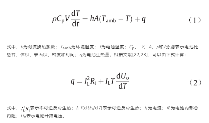 集總參數(shù)熱模型可以用來描述動力電池的生熱行為,該模型假設(shè)電池內(nèi)部溫度分布均勻。根據(jù)能量守恒定律,電池總產(chǎn)熱量等于對流換熱量與生熱量之和,具體可以表示為: