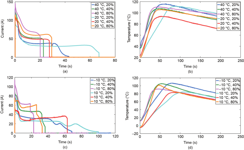 ③具有較高初始SOC值的電池在所有環(huán)境溫度下的溫升速率相對較大。此外,我們前期的研究工作也總結(jié)分析了其他外部短路相關(guān)測試結(jié)果。