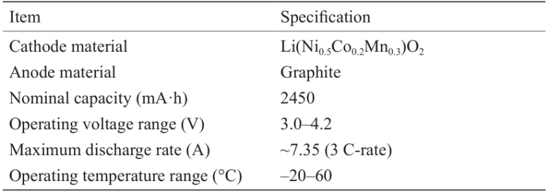 表1 鎳鈷錳三元材料鋰離子電池規(guī)格