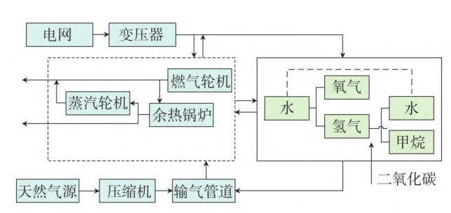 天然氣廠中電能到天然氣的轉(zhuǎn)化生產(chǎn)過程包括以下兩個步驟:首先電解水產(chǎn)生氫氣和氧氣,然后氫氣和二氧化碳在甲烷化反應(yīng)裝置中生成甲烷和水。二氧化碳在整個反應(yīng)過程中作為能量載體進行再循環(huán),不會產(chǎn)生有害氣體,是一種零碳排放能源的使用方法。