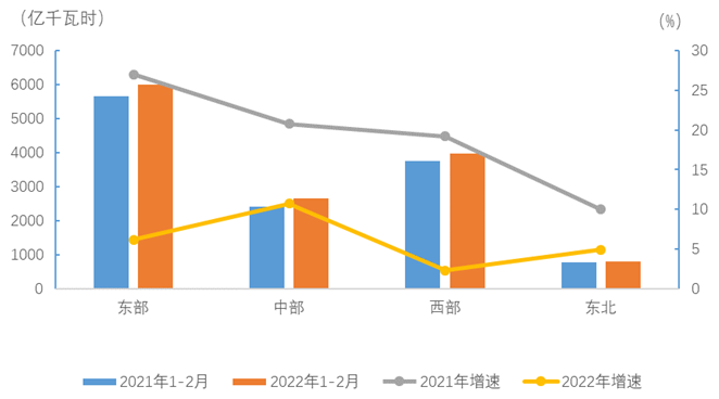 1-2月,東、中、西部和東北地區(qū)②全社會用電量分別為6006、2666、3986和809億千瓦時(shí),增速分別為6.2%、10.7%、2.3%和5.0%。