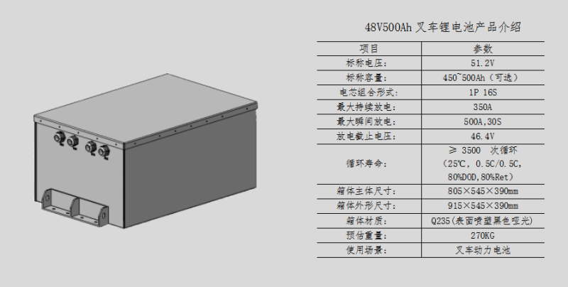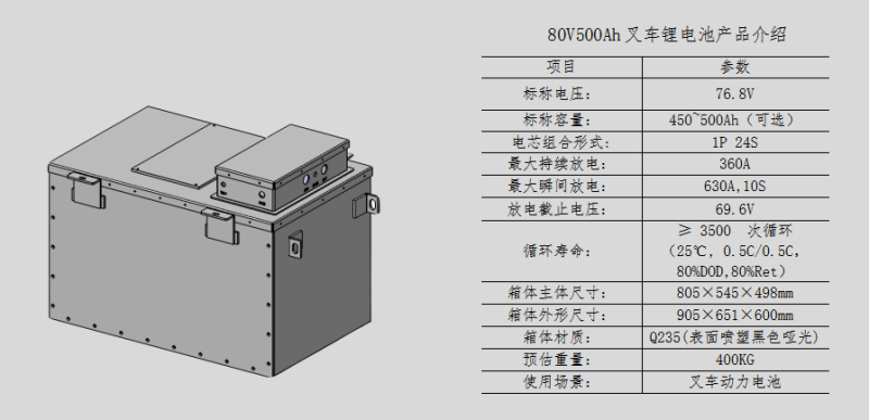 具備80V500Ah與48V500Ah兩種型號,可為客戶提供定制化服務(wù),專注為叉車提供鋰電驅(qū)動解決方案?;谛乱淮膭恿夹g(shù)和電源管理系統(tǒng),相比傳統(tǒng)鉛酸電池可節(jié)省50%綜合成本;相比傳統(tǒng)燃油可節(jié)省80%綜合成本。具備高安全、高效率、長壽命、環(huán)保、隨充隨用、免維護等特性。