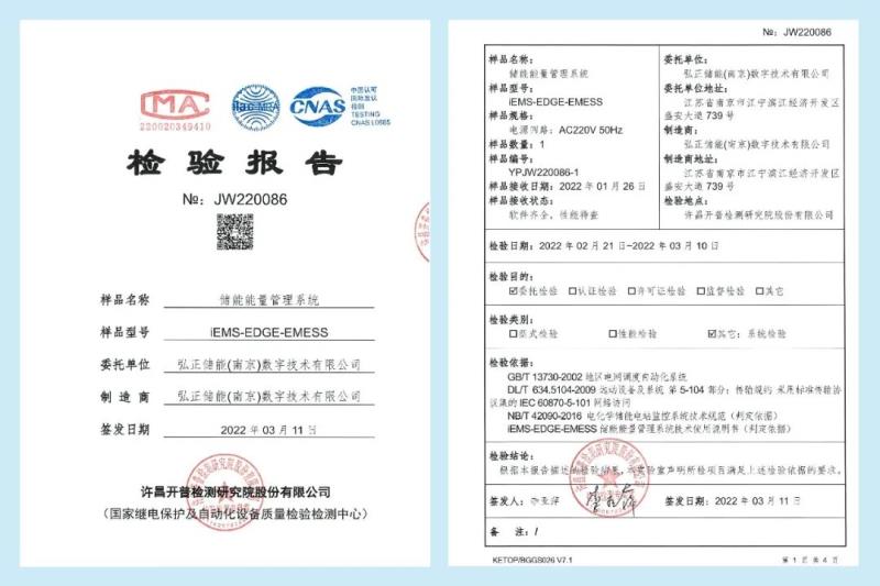 中國儲能網(wǎng)訊:近日,弘正自主研發(fā)的儲能能量管理系統(tǒng)iEMS-EDGE-EMESS通過了NB T 42090-2016,DL/T 634.5104-2009,GB/T 13730-2002標(biāo)準的檢測,順利取得開普實驗室出具的檢測報告(No.JW220086)。