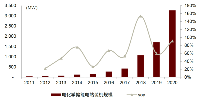 中國(guó)儲(chǔ)能裝機(jī)規(guī)模逐年高增。根據(jù)CNESA數(shù)據(jù),2018年中國(guó)電化學(xué)儲(chǔ)能裝機(jī)突破1GWh,2019年提升至1.7GWh并在2020年達(dá)3.3GWh,裝機(jī)分別同比增長(zhǎng)154%/59%/91%。