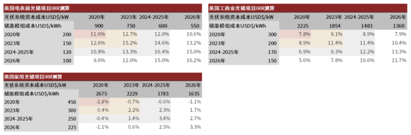 圖表19:美國(guó)表前光儲(chǔ)項(xiàng)目/工商業(yè)光儲(chǔ)項(xiàng)目/家用光儲(chǔ)項(xiàng)目IRR測(cè)算