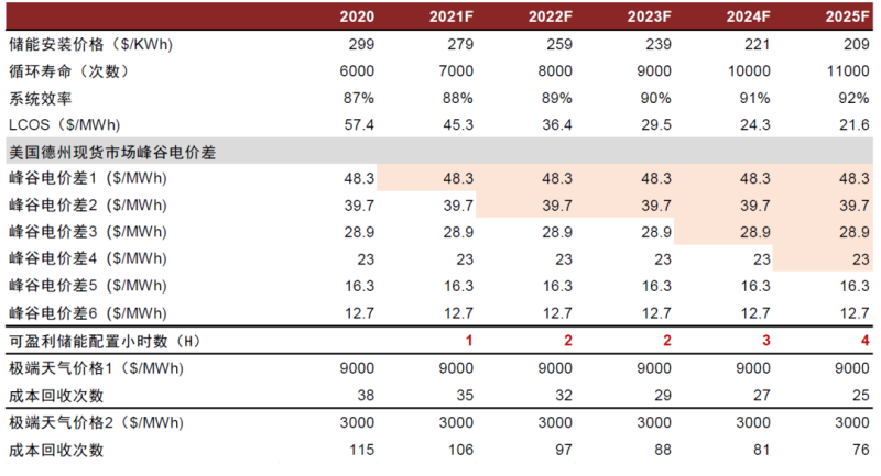 對(duì)2020-2021年美國(guó)德州電力現(xiàn)貨交易價(jià)格分析,平均日內(nèi)峰谷電價(jià)差最大為48.3$/MWh,儲(chǔ)能在2021年的使用成本為45.3$/MWh,即配置1小時(shí)可獲利,我們預(yù)計(jì)隨著儲(chǔ)能成本和壽命的增加,其套利空間也在逐漸擴(kuò)大,而一些極端氣候造成的極端電價(jià)情形觸發(fā)時(shí),將大幅縮短儲(chǔ)能的回收周期。