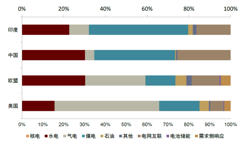 圖表8:典型國(guó)家及地區(qū)2020年靈活性資源結(jié)構(gòu)