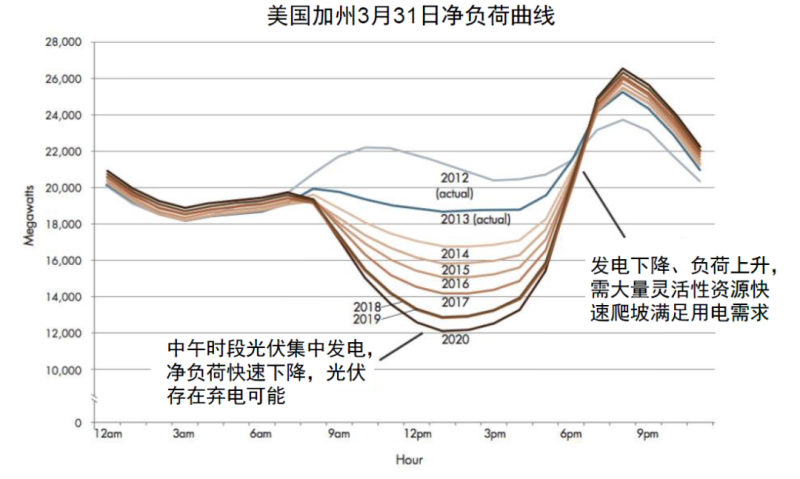 波動(dòng)性可再生能源增加電力系統(tǒng)不穩(wěn)定性,靈活性資源需求增長(zhǎng)。波動(dòng)性可再生能源(VRE)指具有波動(dòng)特性且自調(diào)節(jié)能力較低的可再生能源,包括光伏、風(fēng)電、潮汐發(fā)電等。波動(dòng)性可再生能源發(fā)展初期,電力系統(tǒng)中可調(diào)火電及抽水蓄能足以應(yīng)對(duì)VRE帶來(lái)的擾動(dòng),VRE發(fā)電量可盡數(shù)并網(wǎng)。隨著VRE裝機(jī)量和發(fā)電量逐漸提升,電力系統(tǒng)靈活資源不足,故產(chǎn)生了“棄電”或“零電價(jià)”甚至“負(fù)電價(jià)”。以美國(guó)加州為例,CAISO根據(jù)用電負(fù)荷曲線-光伏發(fā)電曲線得出一天內(nèi)系統(tǒng)的凈負(fù)荷曲線:中午時(shí)段光伏集中發(fā)電、系統(tǒng)凈負(fù)荷下降;夜晚光伏停止發(fā)電、系統(tǒng)凈負(fù)荷上升,從而形成“鴨型曲線”。傍晚光伏發(fā)電下滑用電需求上升,需大量水電、氣電、儲(chǔ)能等靈活性資源快速爬坡發(fā)電以滿足電力需求。