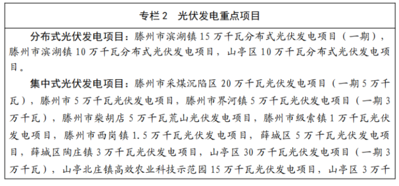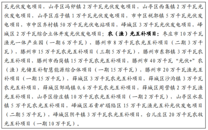 光伏發(fā)電方面,鼓勵資金雄厚、合作意愿強烈、口碑較好的重點企業(yè),充分利用滕州西部煤礦塌陷區(qū)、嶧城東部石膏礦塌陷區(qū)、水庫、坑塘水面等資源,靈活采用農(nóng)光互補、漁光互補等模式,因地制宜布置打樁固定式、漂浮式光伏電站,大力發(fā)展光伏+農(nóng)業(yè)、光伏+漁業(yè);拓展多種光伏應(yīng)用場景,充分發(fā)揮我市產(chǎn)業(yè)技術(shù)規(guī)模優(yōu)勢,探索“光伏+鋰電儲能+空氣源熱泵”“光伏+制氫”“光伏+鋰電儲能+通信基站”“光伏+鋰電儲能+車棚/停車場”等“光伏+”模式,推動光伏發(fā)電就地生產(chǎn)、就近消納。