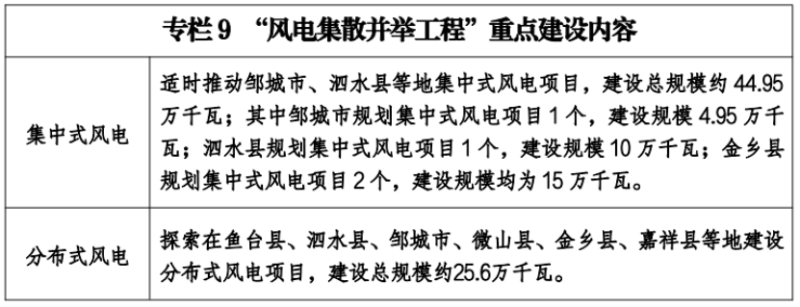 風(fēng)電方面:集散有序推進(jìn)風(fēng)力發(fā)電。加強陸地風(fēng)能資源管理,依托鄒城、泗水已建成風(fēng)電站的經(jīng)驗,考慮生態(tài)紅線、用地等因素,在鄒城、泗水等山區(qū)適時推動集中式風(fēng)電工程建設(shè),探索在魚臺、泗水、鄒城、微山、金鄉(xiāng)、嘉祥等平原地區(qū)推進(jìn)分布式風(fēng)電項目,集散有序推進(jìn)風(fēng)力發(fā)電,逐步增加風(fēng)電規(guī)模。到2025年,建成、在建風(fēng)電裝機總量力爭達(dá)到95萬千瓦左右。
