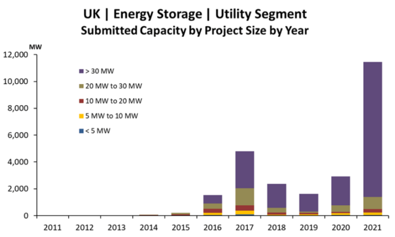 中國儲能網(wǎng)訊:從2016年開始,英國能源市場對電池儲能系統(tǒng)(BESS)的需求不斷增長,使其成為當(dāng)今全球市場領(lǐng)先的活動中心之一。英國的公用事業(yè)規(guī)模儲能活動在2021年強勁增長,與2020年相比,年度部署量增長了70%。此外,到2021年底,未來項目的管道增加了11吉瓦,達到27吉瓦以上。