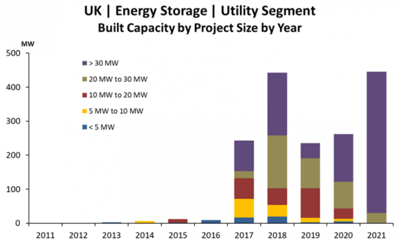 英國在2021年安裝了446兆瓦的公用事業(yè)規(guī)模儲能,接近2018年的高點。圖:太陽能媒體市場研究。