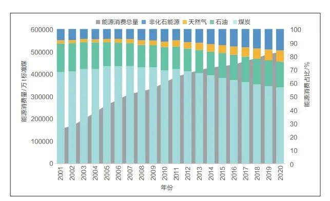圖4 中國能源消費(fèi)走勢(shì)及能源結(jié)構(gòu)占比(2001-2020年)