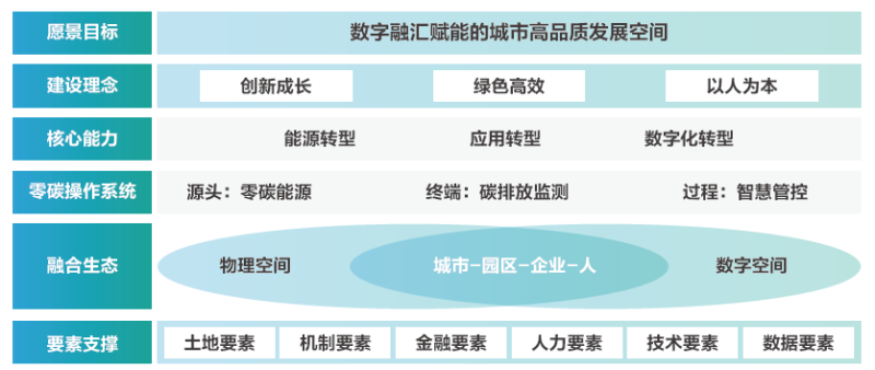 2. 零碳智慧園區(qū)藍(lán)圖架構(gòu)。零碳智慧園區(qū)頂層設(shè)計(jì)系統(tǒng)融入碳中和理念,愿景目標(biāo)決定了園區(qū)的理想和前進(jìn)方向,強(qiáng)調(diào)“數(shù)字融匯賦能”,落腳點(diǎn)為“高品質(zhì)發(fā)展”,建設(shè)理念明確園區(qū)建設(shè)的原則和要求,強(qiáng)調(diào)創(chuàng)新成長(zhǎng)、綠色高效和以人為本,兼顧綠色與發(fā)展、兼顧生產(chǎn)和生態(tài)的全面規(guī)劃。